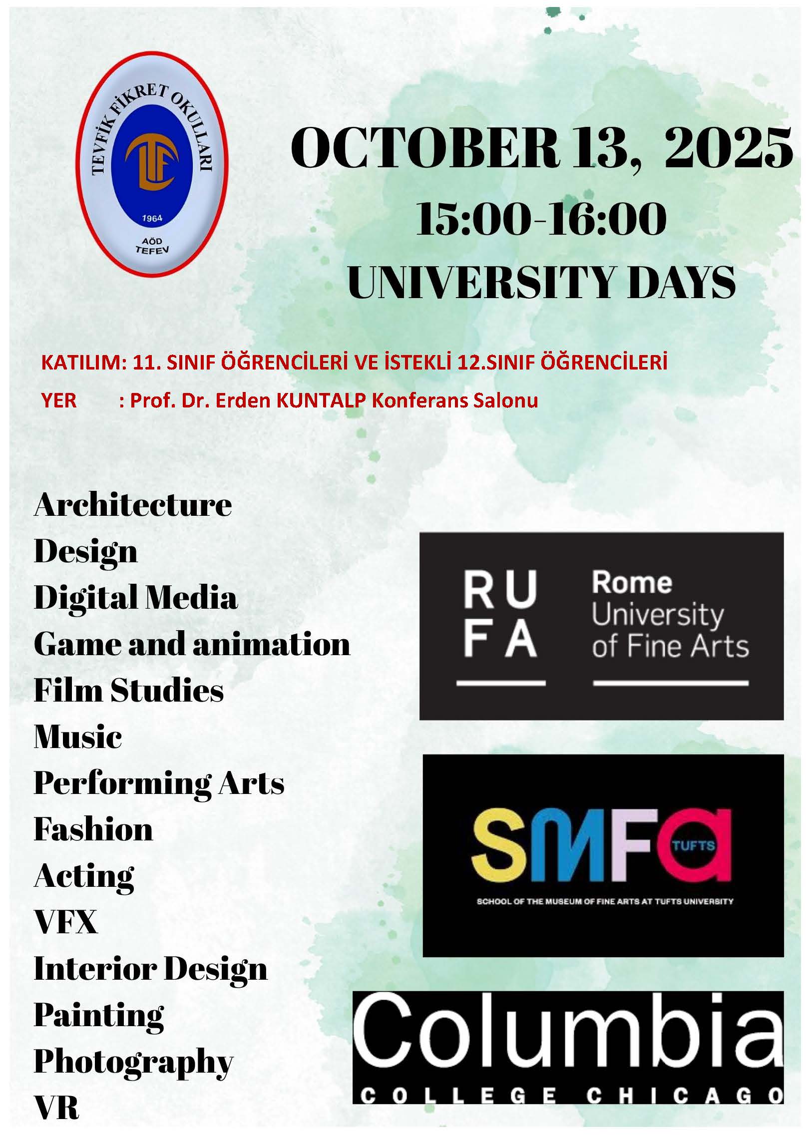 Rome University of Fine Arts / ITALY – Irene Capanna, School of the Museum of Fine Arts at TUFTS University / US – Virginia Casey ve Columbia College Chicago / US – Skye Rust’ın katılımlarıyla; Sanat, Tasarım, Teknoloji ve Mimarlık alanında (Animation, Entertainment Business, Business of Art and Design, AI for the Creative Industries, Cyber Security, Architecture, Digital Arts ( Game Design, 3D + Computer Animation, Virtual Reality Development), Film, TV studies and Digital Media, Design Studies ( architectural design, industrial design, product design, interior design, transportation design, visual design, etc), Photography, Fine Arts, Acting, Curatorial Studies, Performing Arts, Music, Dance, Fashion studies) konferans ve masa başı bilgilendirme çalışması yapılmıştır.